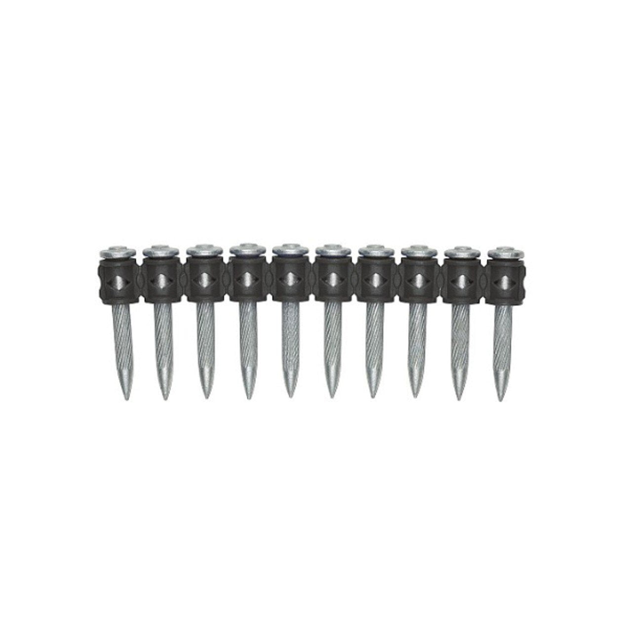 CSI Spiral Drive Pins are designed for permanently fastening a fixture to concrete, concrete over steel deck, concrete masonry walls and A36 or A572 / A992 structural steel. The fasteners are manufactured with an 8mm head and 0.157" diameter shank in various lengths. A spiral knurled shank design provides consistent optimized performance in steel base materials. For single fasteners, a plastic washer is mounted on the pin shank to retain the drive pin in the barrel of the tool and provide centered guidance during the driving operation. The fasteners are also available in collated strips.