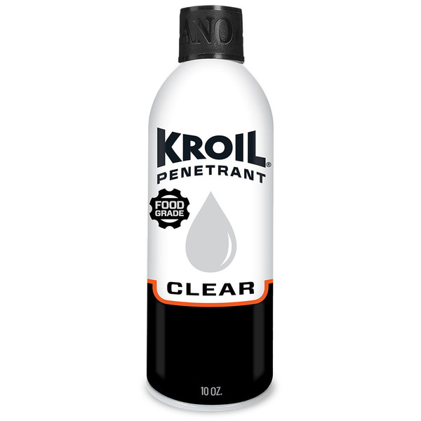 Kroil Clear food-grade penetrating oil works quickly to free rusted and seized nuts, bolts, fasteners, shafts, pulleys, joints, linkages, and more. It is odorless and non-staining and perfect for planned and unplanned maintenance, as well as equipment disassembly.