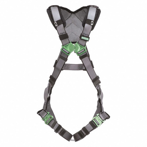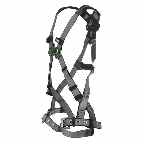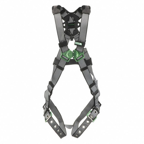 V-FIT safety harness with one D-ring on the upper back to attach to a self-retracting lifeline or shock-absorbing lanyard that connects to a secure anchor point. Options available for size, leg strap connections, and padding.