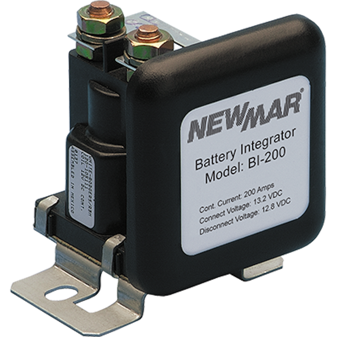 NewMar BI-200 Battery Integrator, 12 Volt, 200 AmpCharging multiple battery banks without use of diode isolators dictates that the batteries be connected or ?integrated? only whenever a charge voltage is present so that they may be charged simultaneously, then disconnected or ?isolated? when in use to allow for selective discharge and avoid having the secondary or standby battery drain into the primary battery.Battery Integrators perform this function automatically, acting as a ?smart? switch to connect independent battery banks only when a charging voltage is present. Otherwise, they are isolated, and discharge between banks is prevented.The traditional rugged and reliable diode isolator can also be used for this function, as it also maintains isolation between banks and allows charging from multiple sources. However, one drawback is inefficiency when voltage is lost as current passes through the diodes, resulting in undercharge if the charging source does not compensate for the voltage drop.The Battery Integrator causes no voltage drop in the charging system, while the multiple batteries are charged as a single bank whenever a charging source of approximately 13.2 VDC or 26.4 VDC or greater is present (depending on model).When the alternator or charger is off or a large load causes the voltage to drop below the disconnect point the unit breaks the common tie between the banks. This allows selective battery discharge and prevents ?dumping? of a higher-charged bank into a lower-charged bank. The unit may also be activated to connect other batteries through the key starter or a manual switch to provide an added ?boost? from the secondary battery whenever the starter is engaged and the unit senses there is sufficient voltage in that battery to provide an assist.For systems with more than two banks, an isolator must be installed for each additional bank to provide the same isolation and integration as described above.Dimensions: 3"H x 3.25"W x 2.5"D; Wt: 1 lb.
