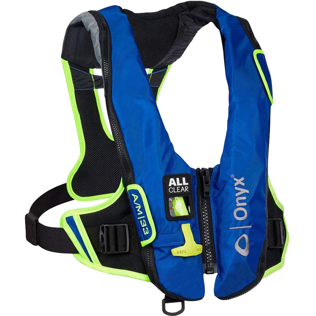 Onyx A/M-33 Impulse All Clear Inflatable Lifevest, Blue Convertible from automatic/manual to manual only inflation. Front zipper closure for a low profile secure fit, air mesh in contact areas, dual adjustments with "webbing locks" to manage excess webbing. Secure Pull -- clips to life jacket allows for quick release when pulled for inflation, Quickburst zipper opens upon inflation easy to repack, inflation chamber has SOLAS grade, reflective material and light attachment, V-back for comfort and faster donning. Features a 1.5" body belt, protective cover uses durable 400 denier nylon oxford and 500 denier Cordura, hanging loop for drying, marine whistle included, extended sizing fits up to a 65" chest.