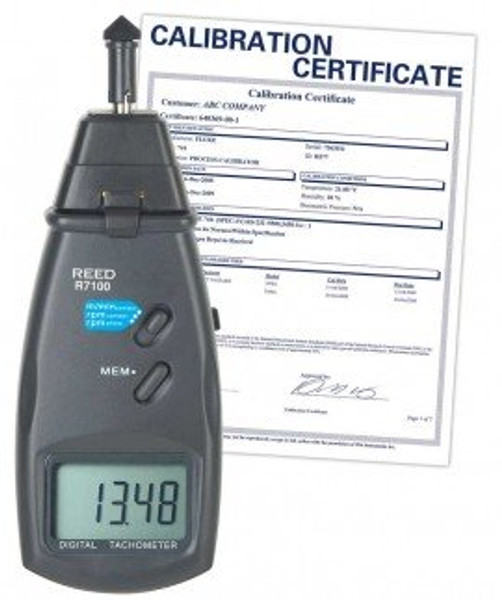 This tachometer features both the ability to measure RPM (revolutions per minute) in rotational equipment and surface speed m/min (meters per minute) with included contact adapters. The R7100 features a built-in laser pointer to assist with identifying the target area.