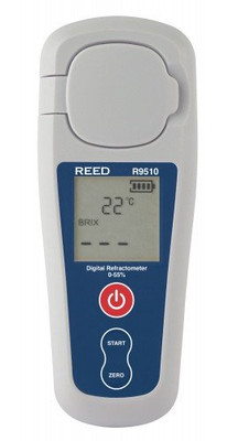 This brix refractometer shows the concentration (percentage) of sucrose in 2 to 3 drops of a sample. The R9500 is used to measure sugar concentration in fruit juices and has been calibrated to the sucrose content contained in 100g of cane sugar.