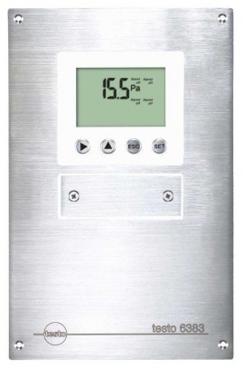 Testo 6383 differential pressure transmitter in cleanroom-conform panel design, optionally with humidity/temperature, accuracy ±0.3% of measuring range final value, automatic zero-point adjustment, selectable measuring range between 10 to 10hPa, selectable signal outputs, optional display, output of all relevant pressure and humidity parameters.