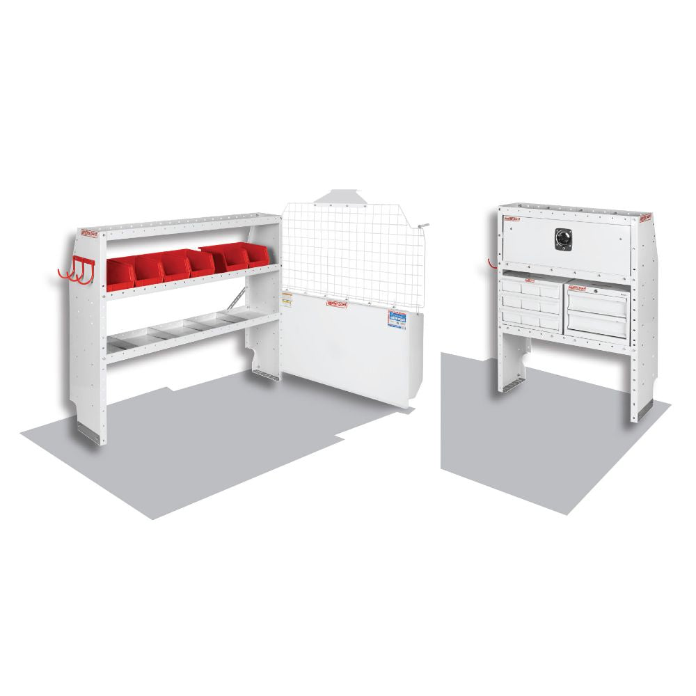 Designed for electricians and electrical contractors, the Model 600-8344 van package for RAM ProMaster City long wheel base vans provides adjustable cargo van shelving sized to fit the commercial van interior, drawer cabinets, a parts bin cabinet, and accessories. It includes a sturdy van bulkhead partition for maximum protection against shifting loads. Additional van products are available to create a custom van storage solution.