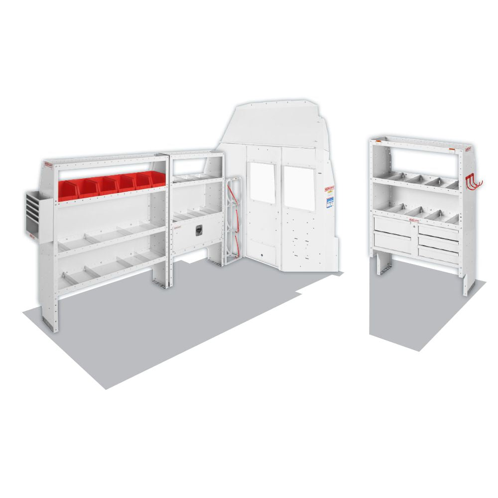 Designed for HVAC professionals and mechanical contractors, the Model 600-8433R van package for High-Roof, 146" wheel base Nissan NV2500 vans provides adjustable cargo van shelving sized to fit the commercial van interior, a shelf door and a tank rack. It includes a sturdy van bulkhead partition for maximum protection against shifting loads. Additional van products are available to create a custom van storage solution.