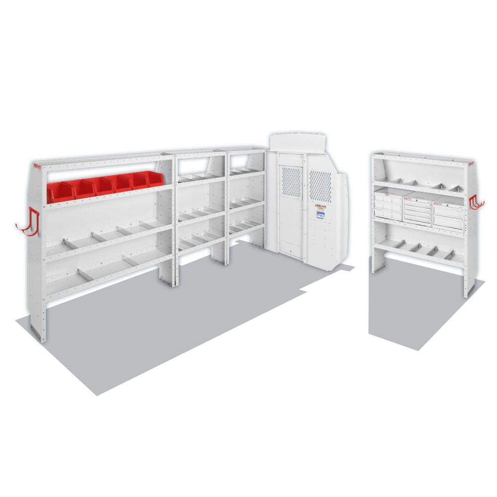 • Includes 60" high adjustable cargo van shelving and a mesh van bulkhead with swinging door kit