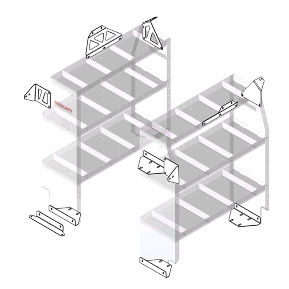 The Model 9752-3-01 Rear Installation Shelf Unit Mounting Kit uses existing reinforced seat belt or cargo tie down points or pre-existing holes provided by RAM in the ProMaster City for faster, easier and more secure shelving installation. No measuring or drilling required, no holes in the van floor.